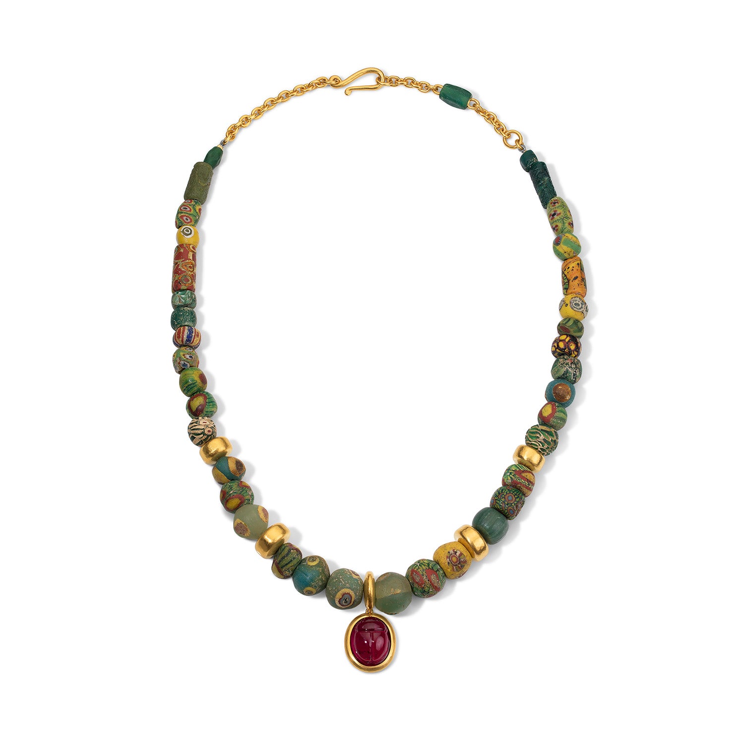 Ancient Bead, 22k Gold, & Rubellite Scarab Necklace