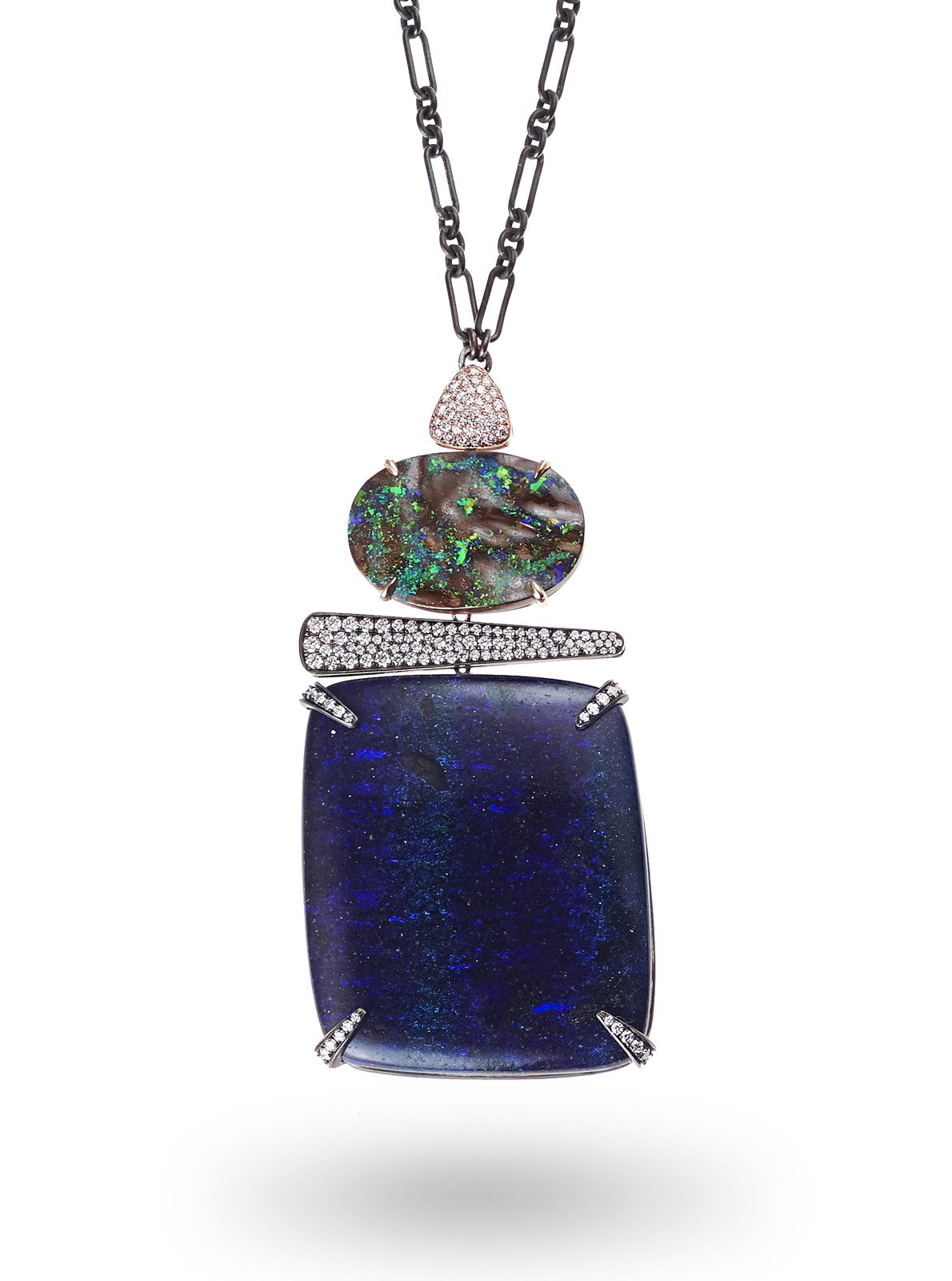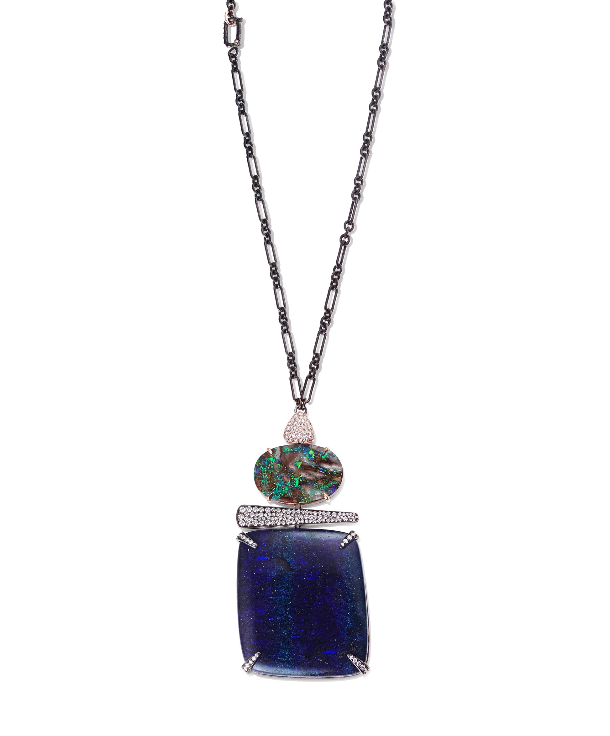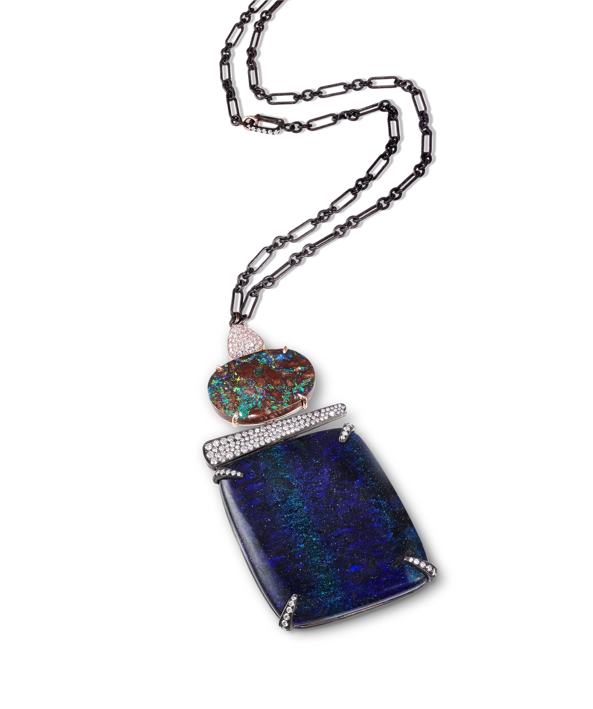 This double opal necklace features Australian Bolder & Andamooka Opals in oxidized silver and 18kt rose gold, accompanied by 2.38 carats of pave diamonds.